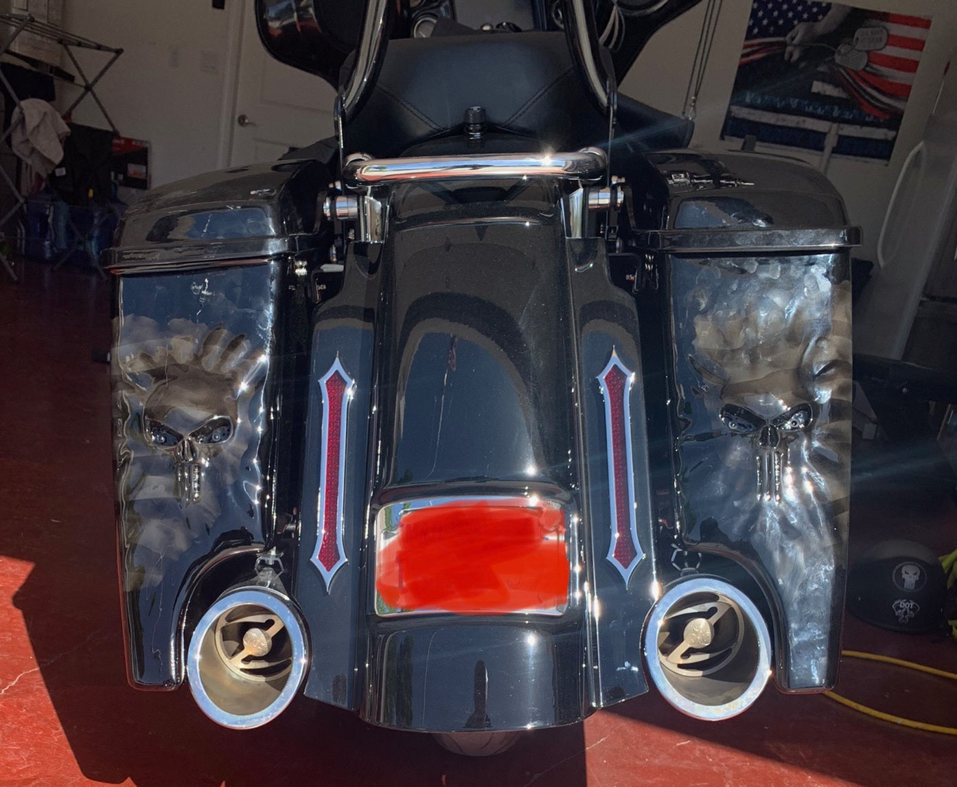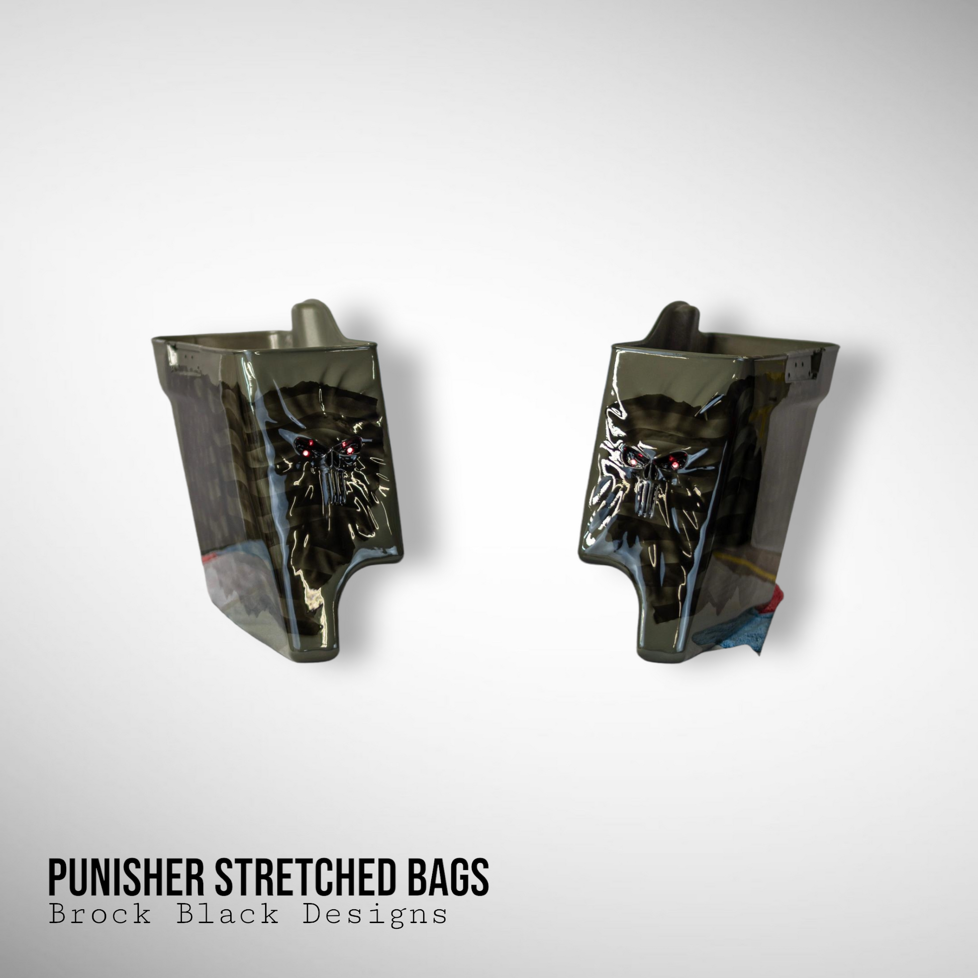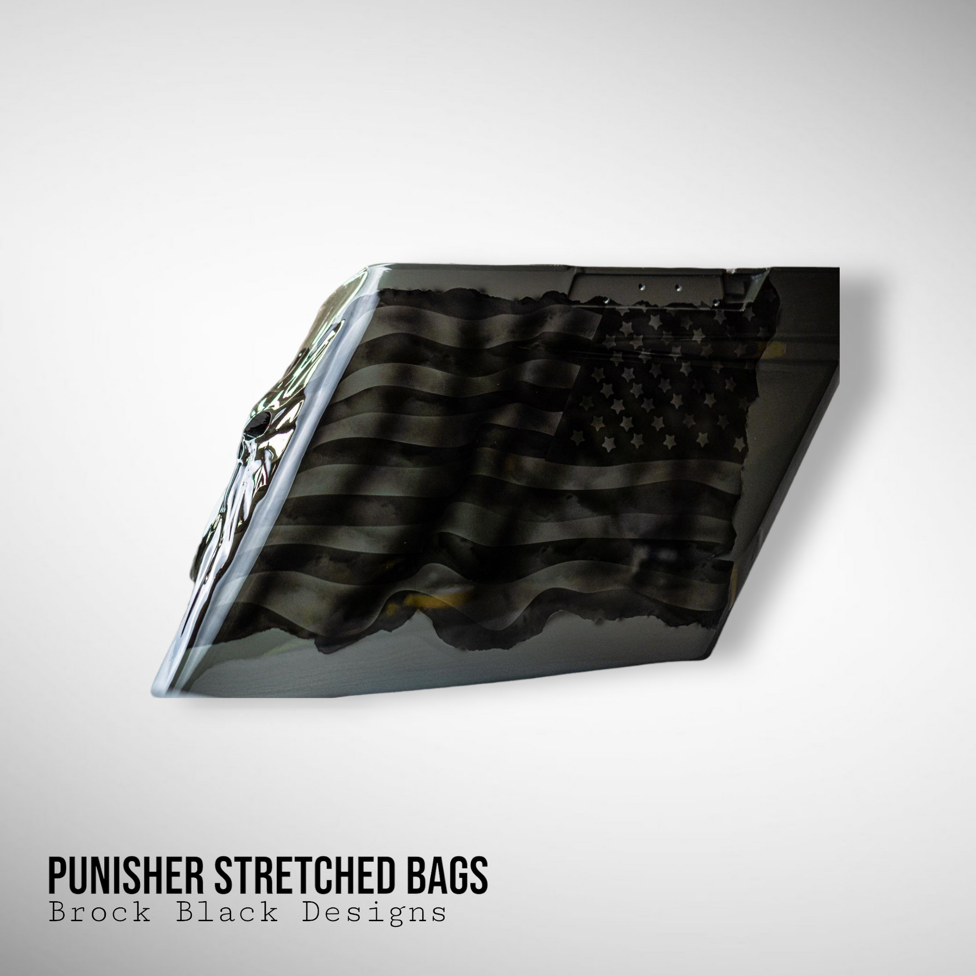 Custom Bilt 3D Punisher stretching through rear bag systems with tattered and worn American flag. Can do any style, design or theme. These are individually built and designed for the customer. These take 3 to 4 weeks to build. We will verify the order and any changes upon order received.