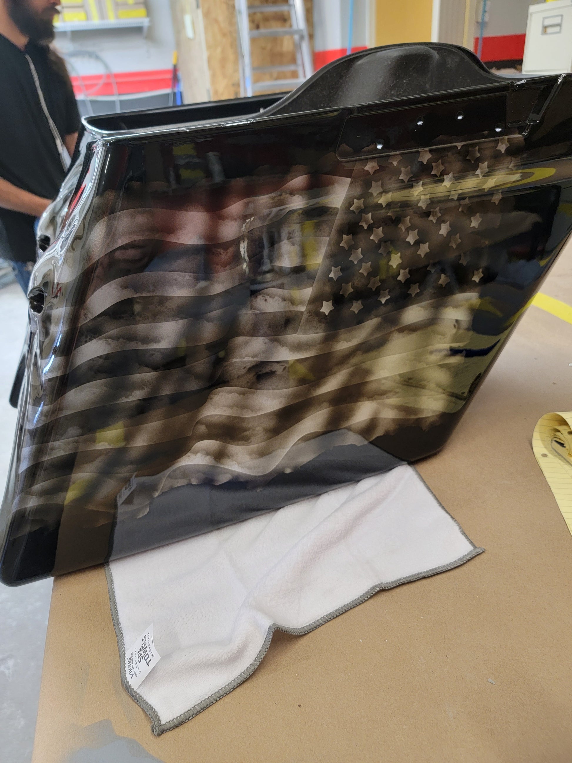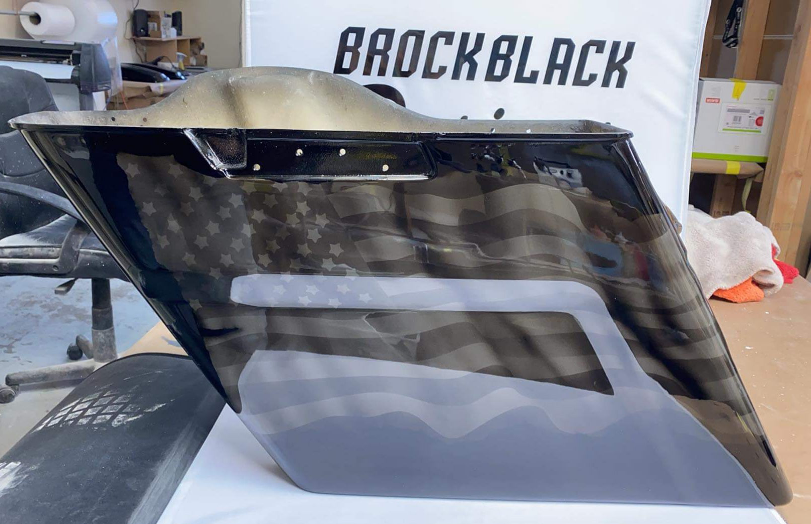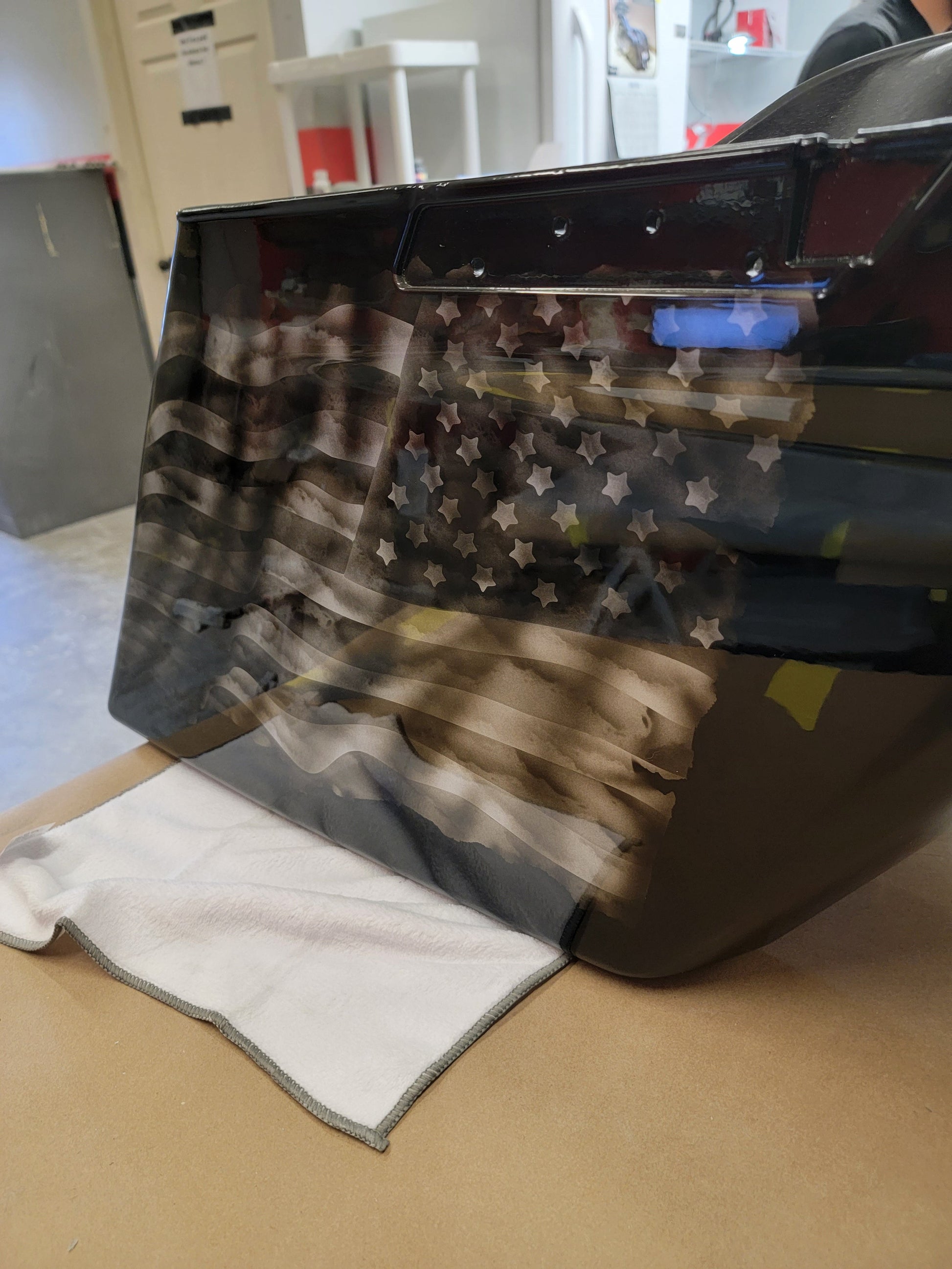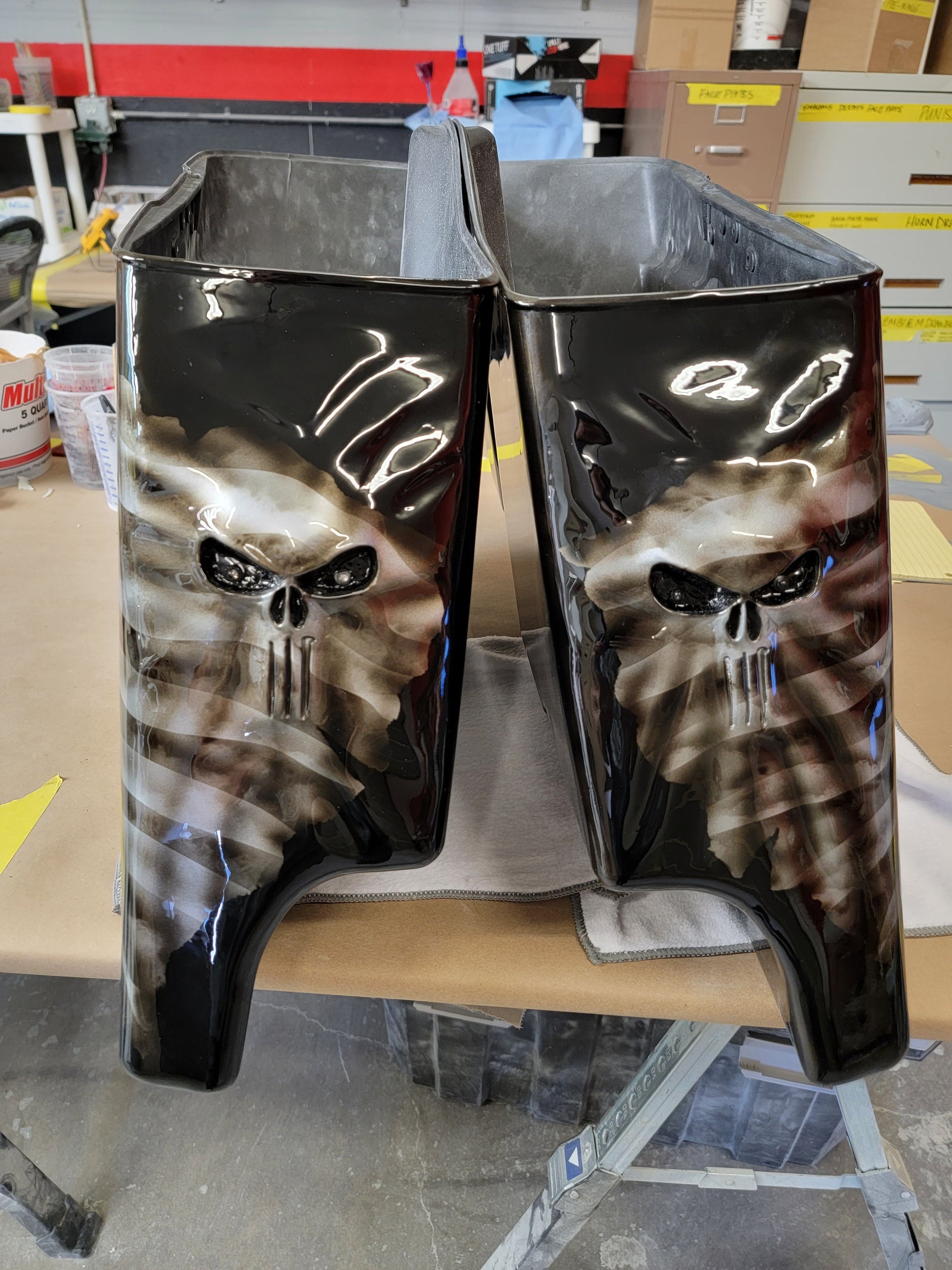 Custom Bilt 3D Punisher stretching through rear bag systems with tattered and worn American flag. Can do any style, design or theme. These are individually built and designed for the customer. These take 3 to 4 weeks to build. We will verify the order and any changes upon order received.